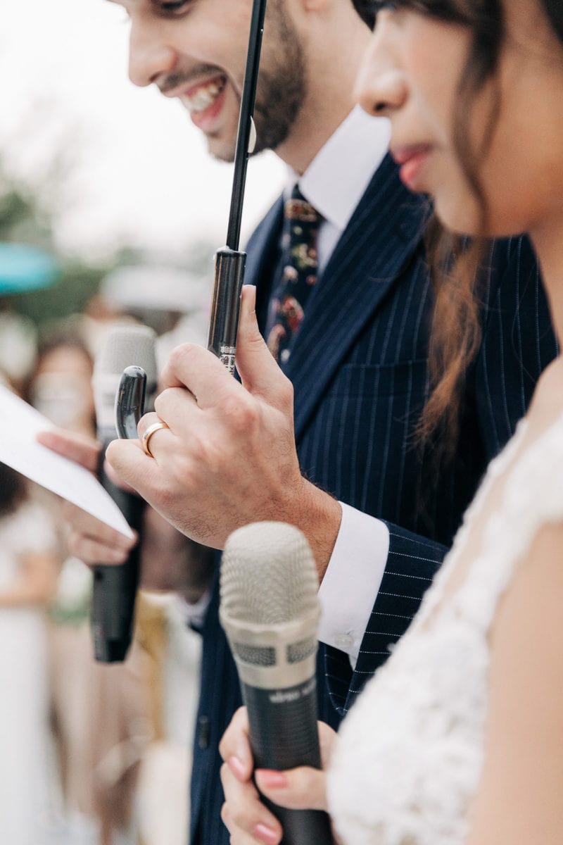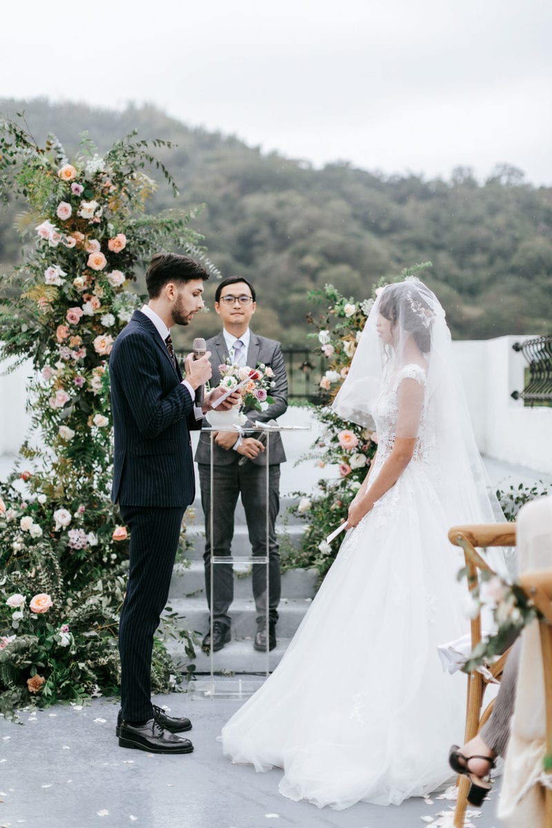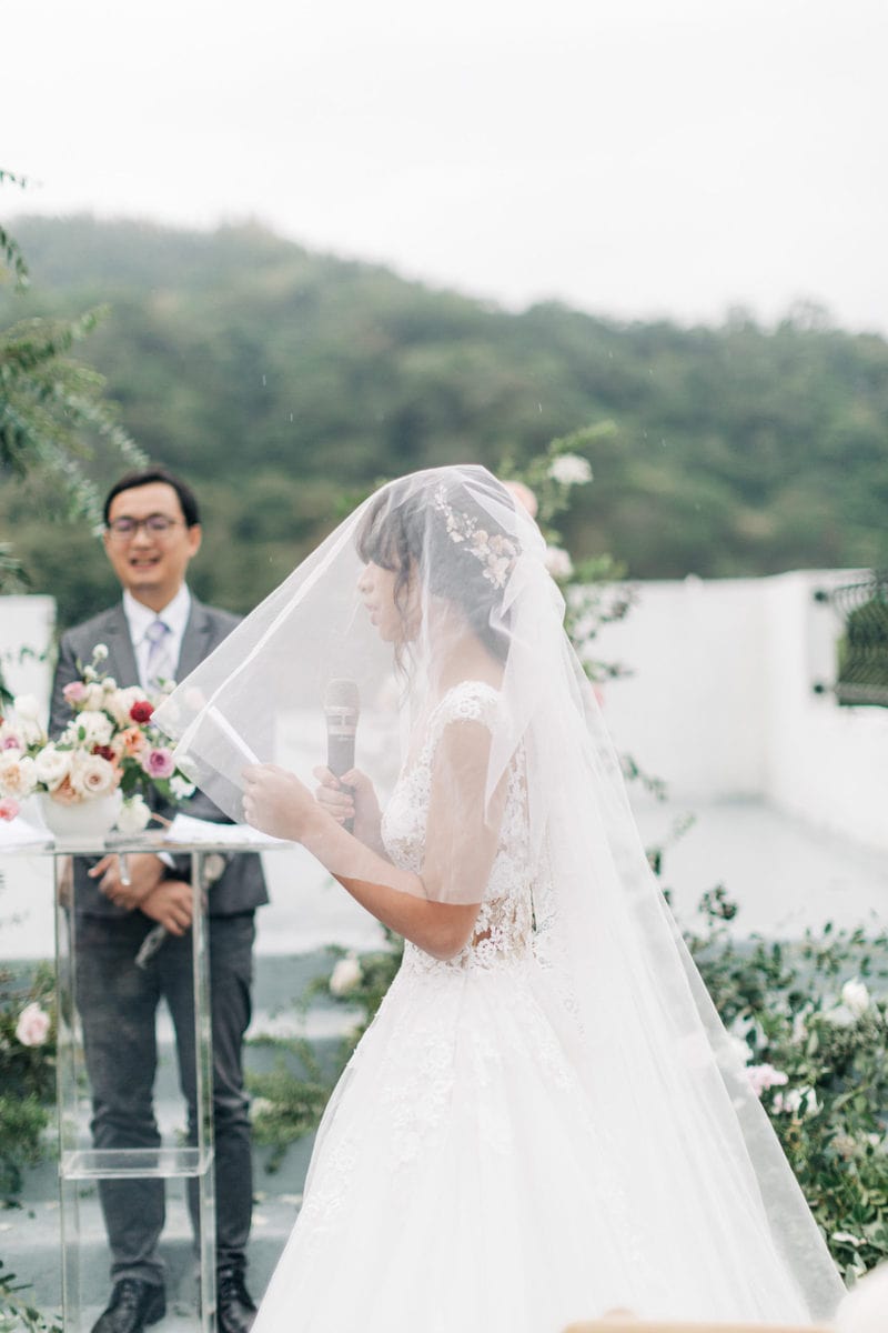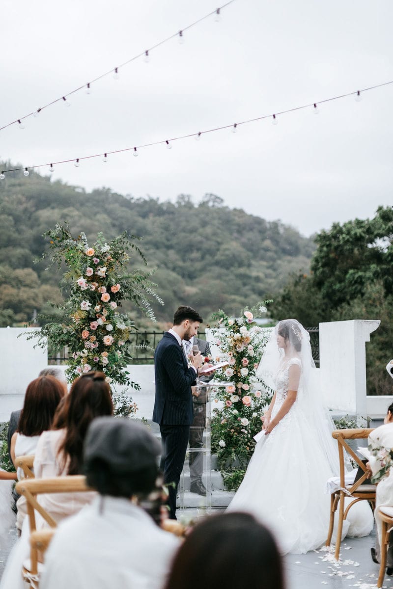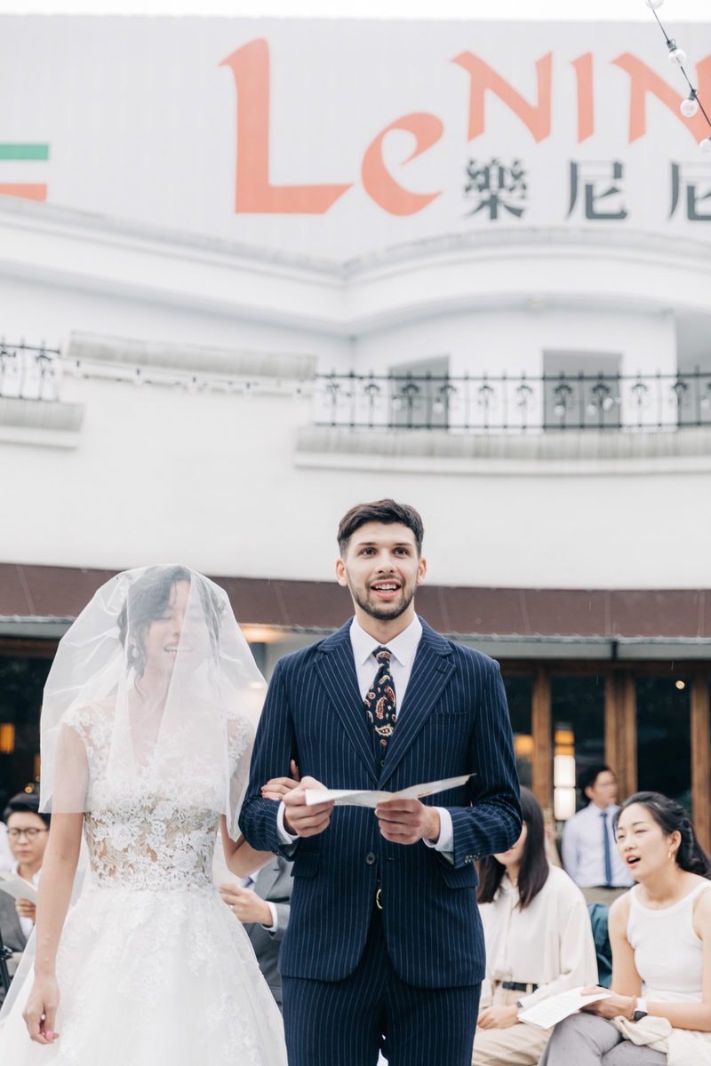 由於新郎與部分賓客沒有那麼熟悉中文,所以這場婚禮以中英文主持的方式進行。雙語主持並無提供即席口譯,口譯是另一個層級、另一種專業,也是我目前無法提供的服務。因此在籌備期,確認所有外文致詞、致謝的翻譯變得非常重要。有哪些橋段需要中英文講解?有哪些致詞需要翻成中文 / 英文?有哪些段落是逐字逐句翻譯,有哪些則是以英文總結即可。