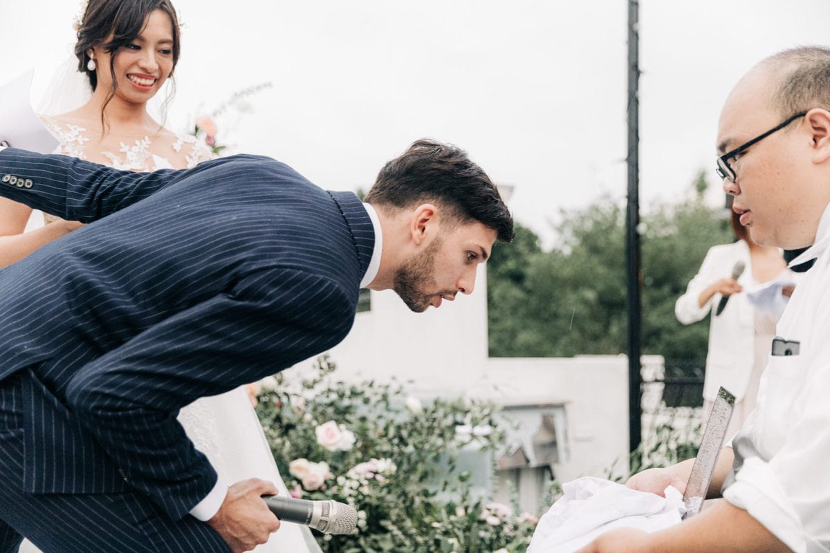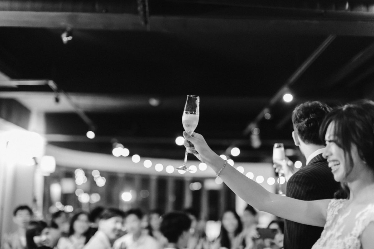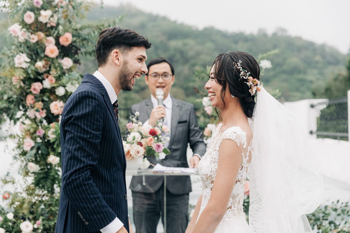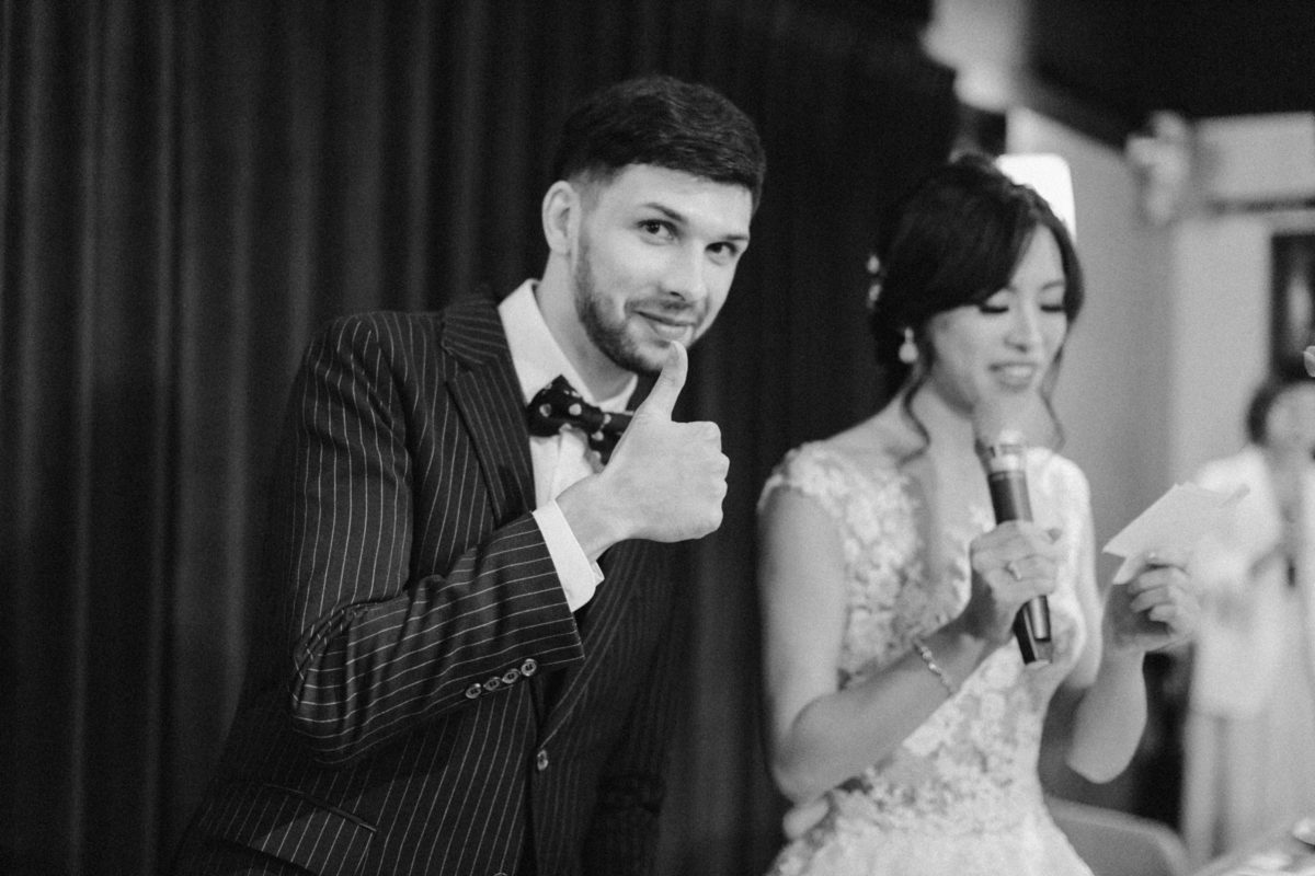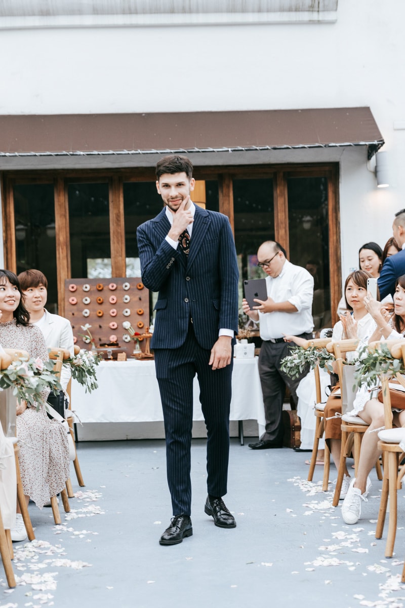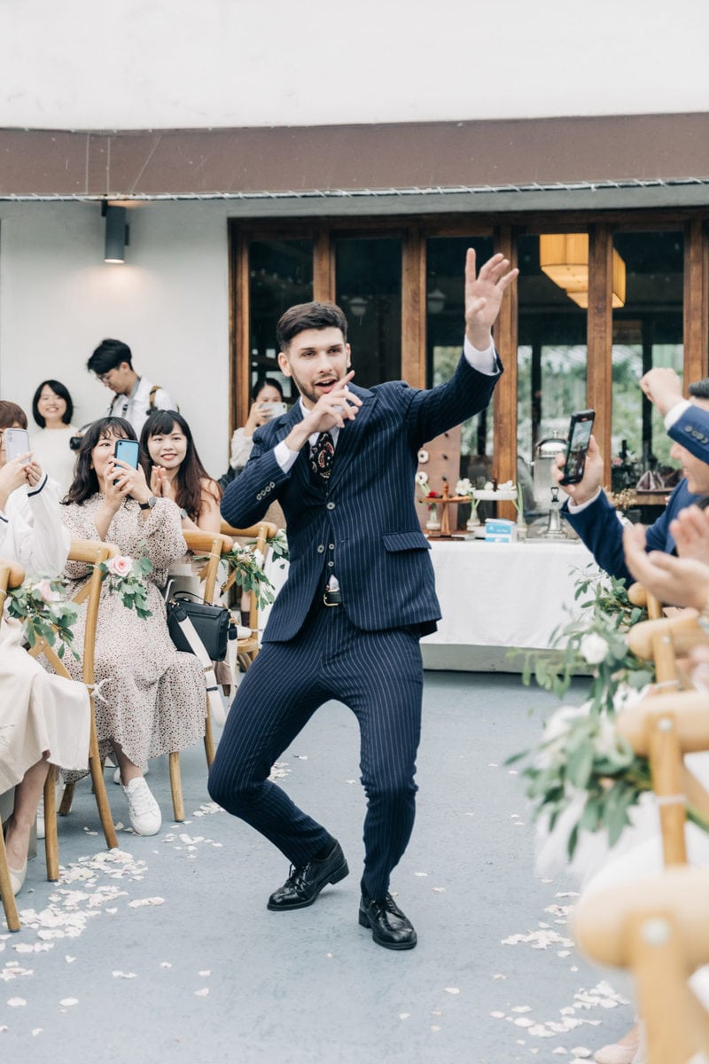 由於新郎與部分賓客沒有那麼熟悉中文,所以這場婚禮以中英文主持的方式進行。雙語主持並無提供即席口譯,口譯是另一個層級、另一種專業,也是我目前無法提供的服務。因此在籌備期,確認所有外文致詞、致謝的翻譯變得非常重要。有哪些橋段需要中英文講解?有哪些致詞需要翻成中文 / 英文?有哪些段落是逐字逐句翻譯,有哪些則是以英文總結即可。