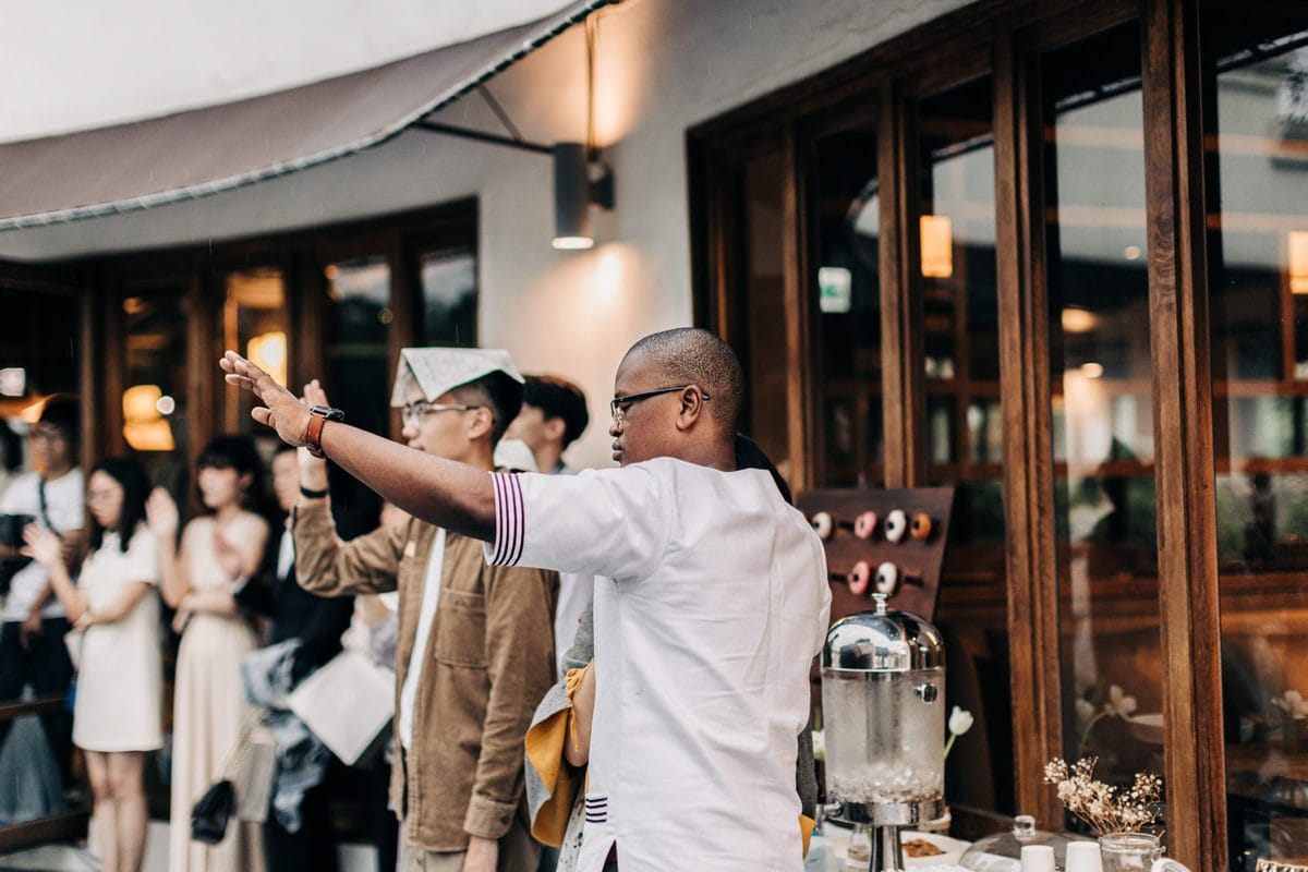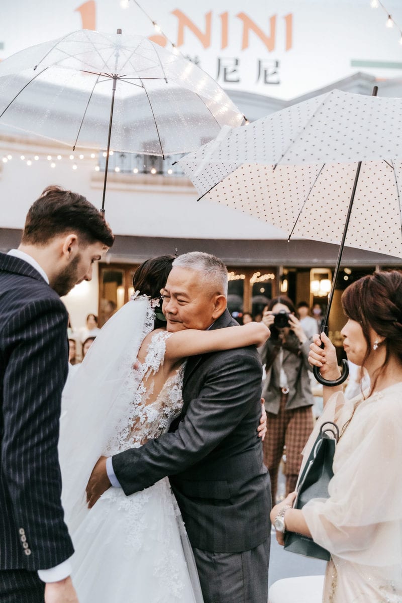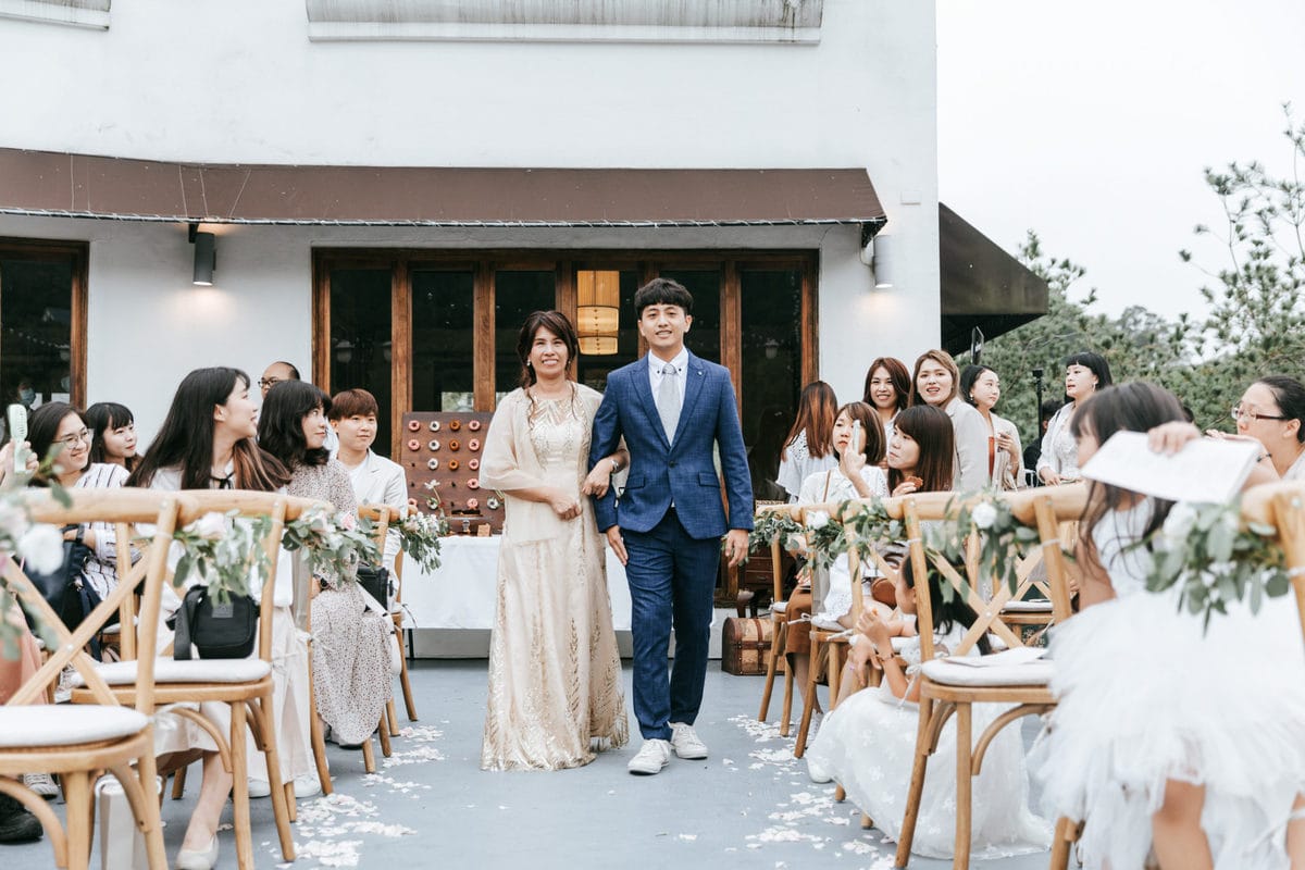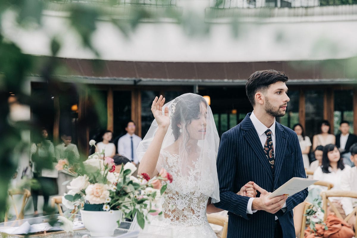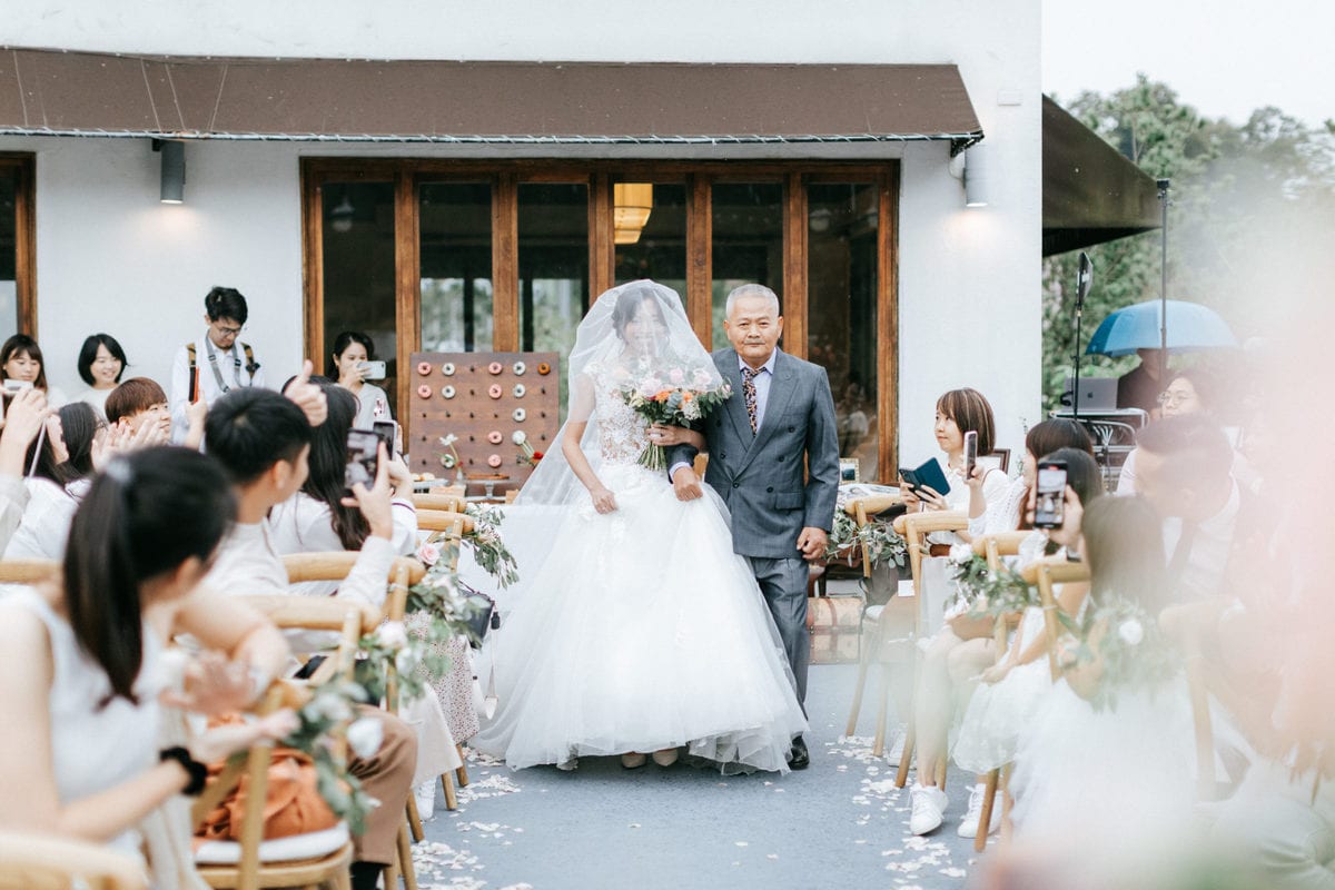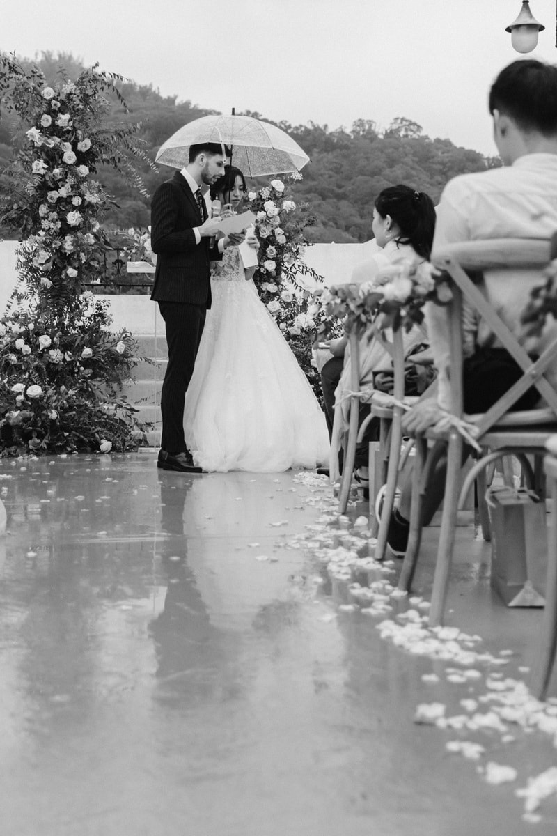 當晚天氣不穩定,證婚時飄起了毛毛細雨。雖然已盡量的加快儀式進行,但仍有許多環節無法省略。現場,沒有賓客抱怨,大家齊聲唱著詩歌,儘管歌詞本已被雨水浸潤。一直到最後儀式結束時,原訂在戶外的桌椅需移動到室內重新打桌。得讓賓客再等待一陣子才能用餐,都不見任何不悅的神情。