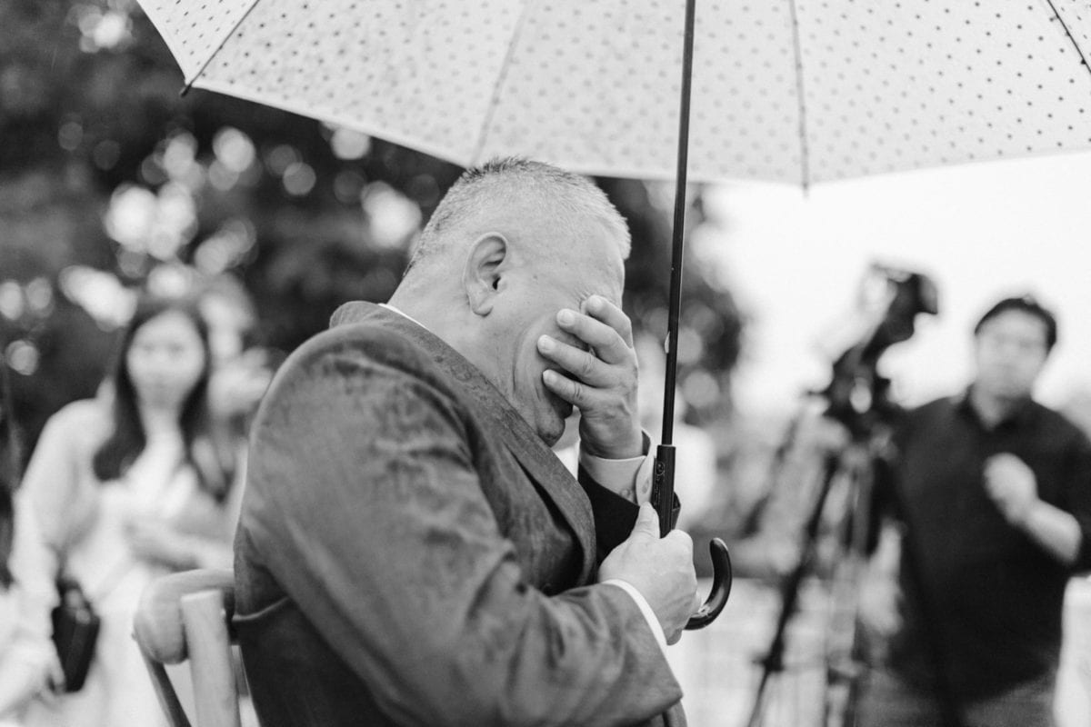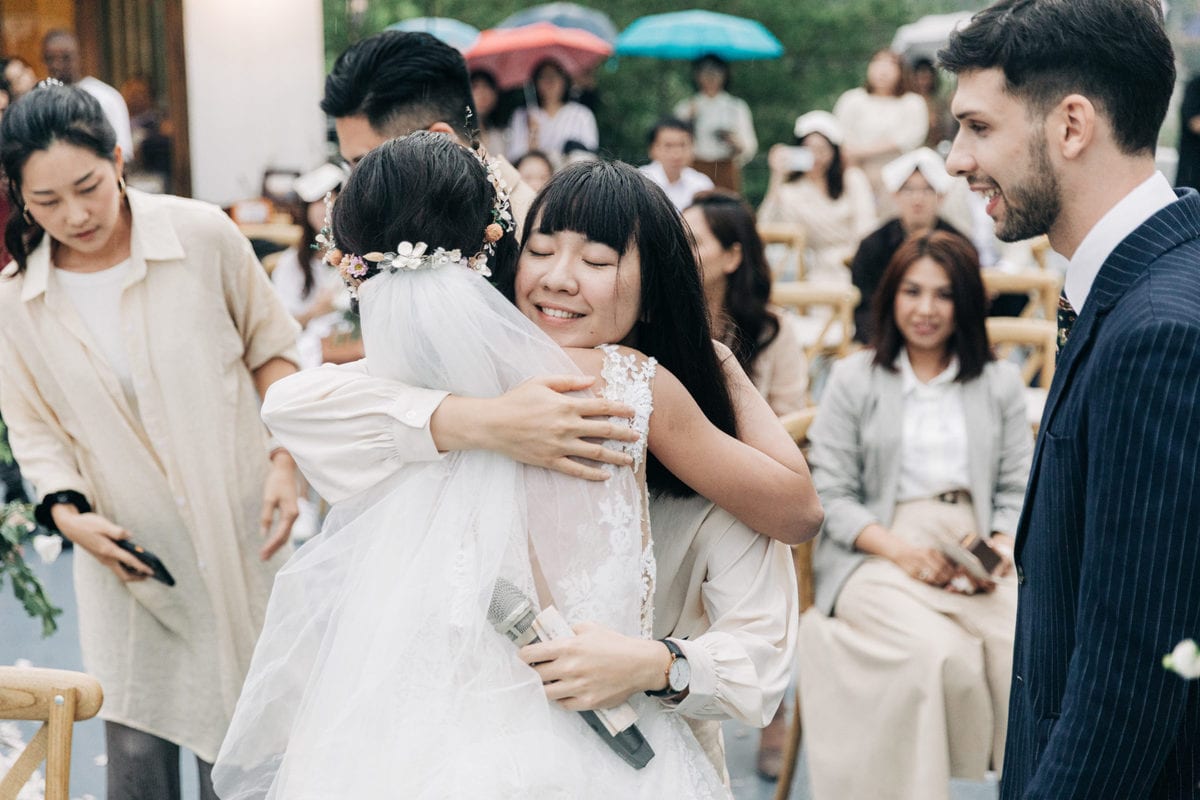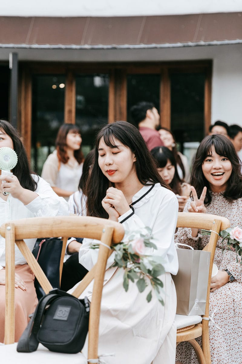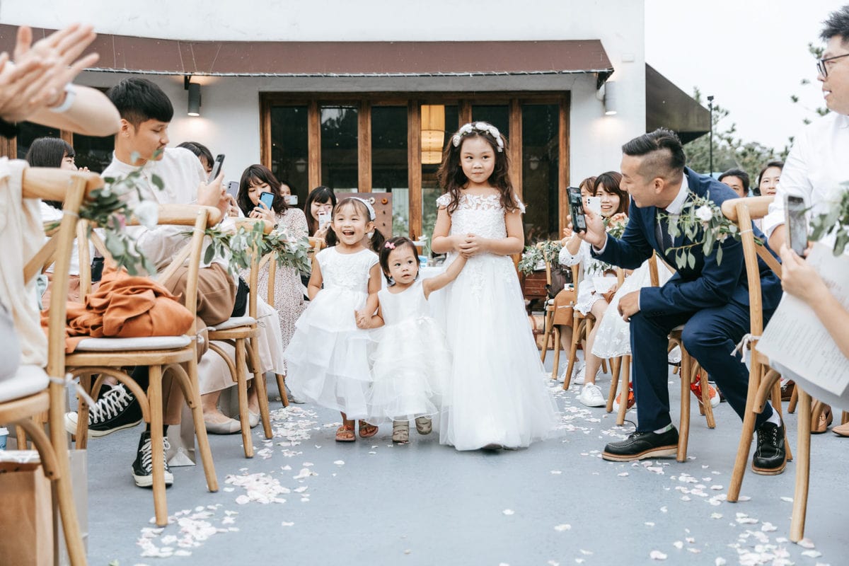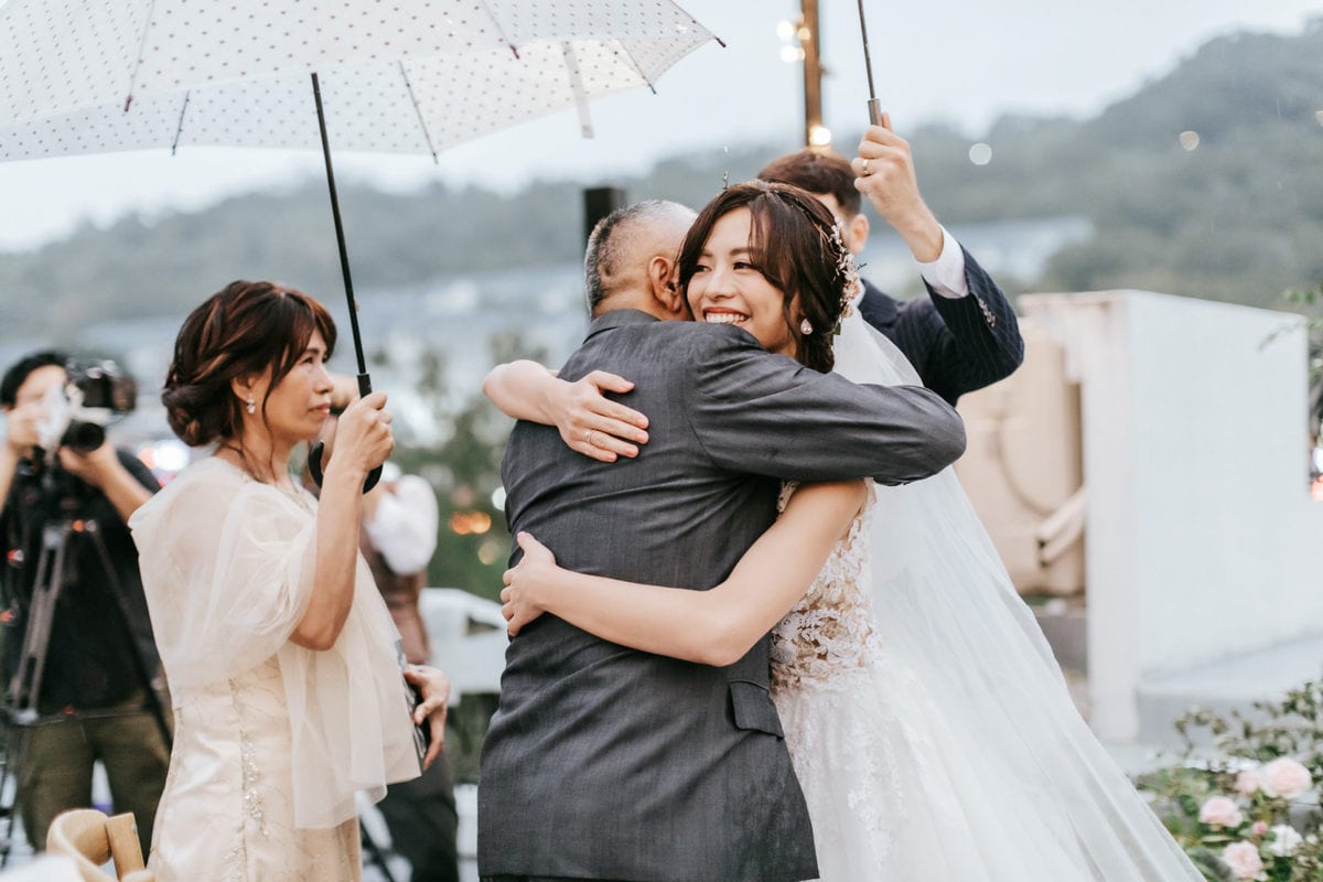 當晚天氣不穩定,證婚時飄起了毛毛細雨。雖然已盡量的加快儀式進行,但仍有許多環節無法省略。現場,沒有賓客抱怨,大家齊聲唱著詩歌,儘管歌詞本已被雨水浸潤。一直到最後儀式結束時,原訂在戶外的桌椅需移動到室內重新打桌。得讓賓客再等待一陣子才能用餐,都不見任何不悅的神情。